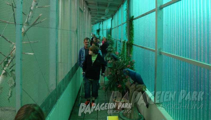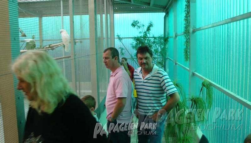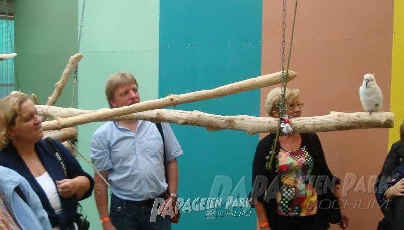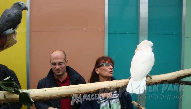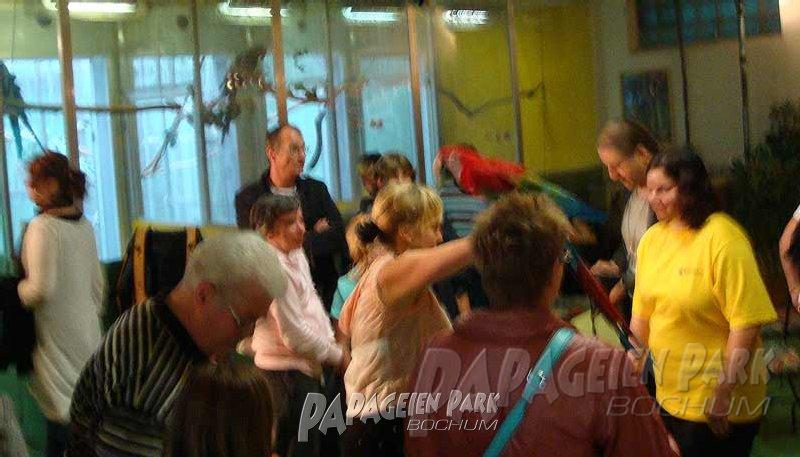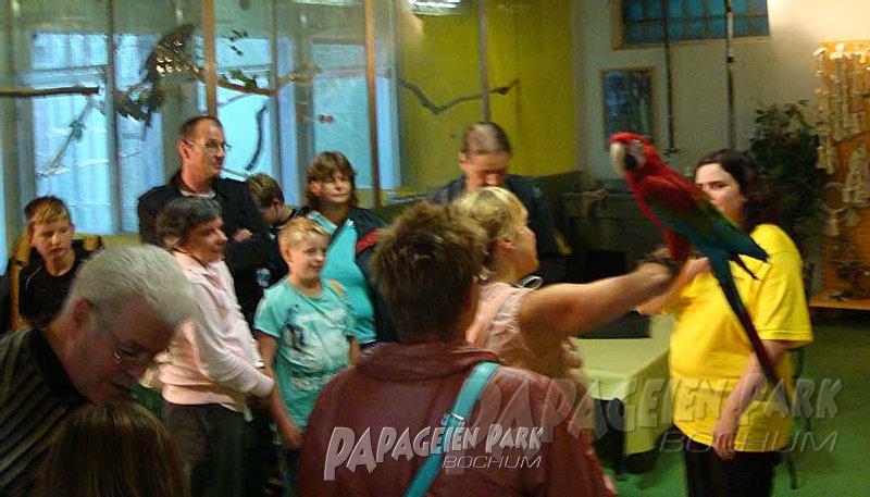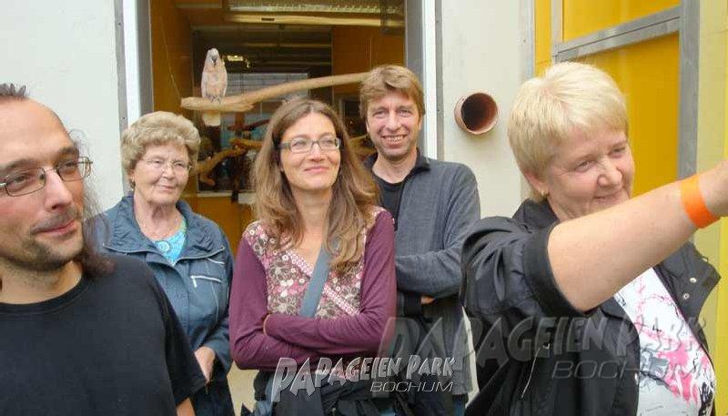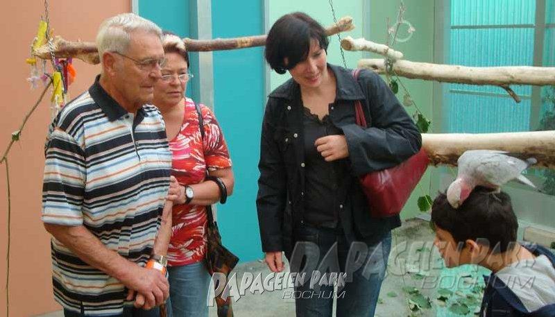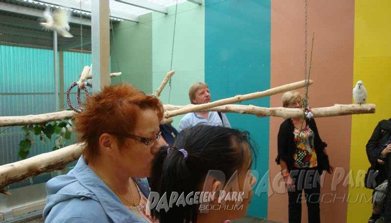 Volles Haus und ein Riesenspaß für vier Generationen beim Familientag, der Dank der komplett überdachten Anlage trotz Regen nicht ins "Wasser" fiel. / Full to bursting at Parrots Park Bochum with four generations enjoying the tame birds. Due to the completely roofed park despite hay rain showers everybody remained dry.