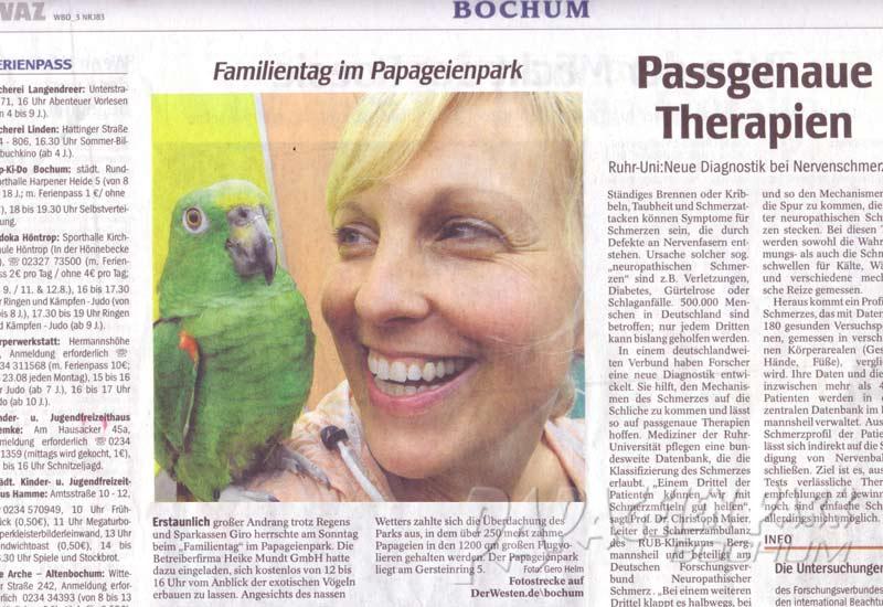 Papageien, Infos, Papageienzubehör, Spielzeug, gesundes Futter und alles, was das Herz der Papageienfans höher schlagen läßt, finden Sie in Bochum und im Online-Shop bei Heike Mundt und dem freundlichen Team vom Papageienpark - den Experten rund um das Thema Papagei: über 250 - meist zahme - Papageien auf 1.200 m2 FLuganlage und in Freiflugvolieren! Und für Liebhaber zahmer Papageien haben wir das Papageienpark Café eröffnet - frischer Kuchen und zutrauliche Vögel: einzigartig...