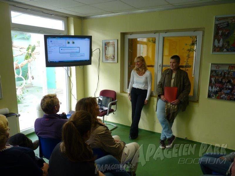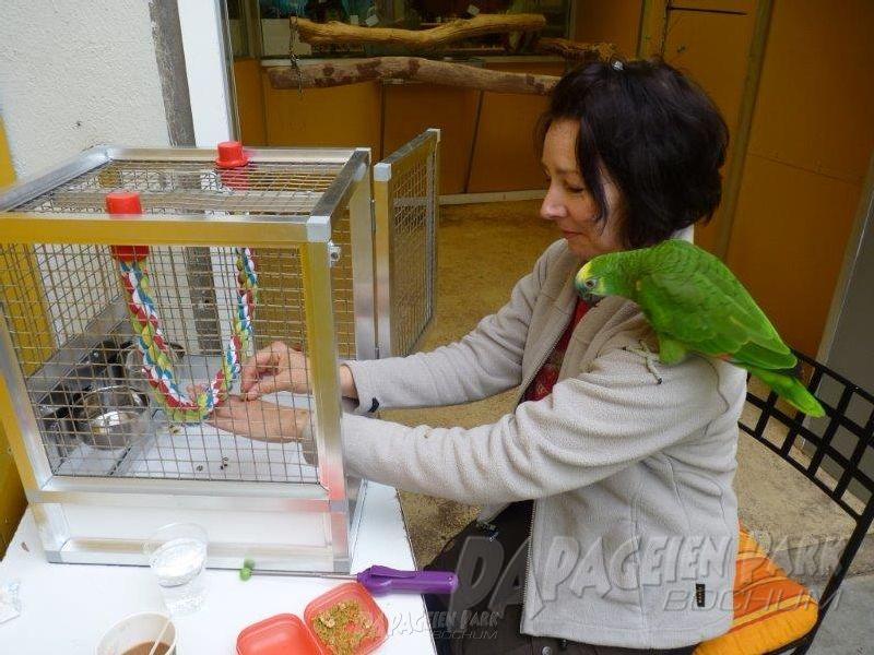 Zum Papageien-Praxistraining kamen engagierte Anfänger und erfahrene Fortgeschrittene Papageienhalter, die mit Ihren Tieren unter der fachkundigen Anleitung von Dipl. Biologin Hildegard Niemann in den Volieren des Papageienpark Bochum trainierten.