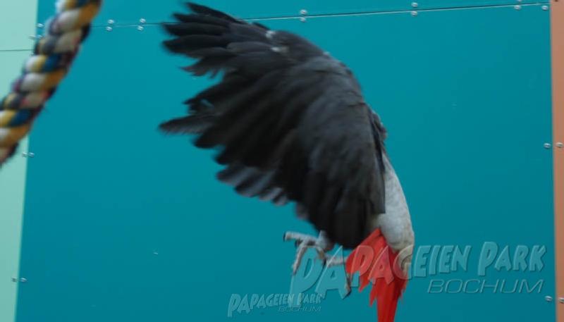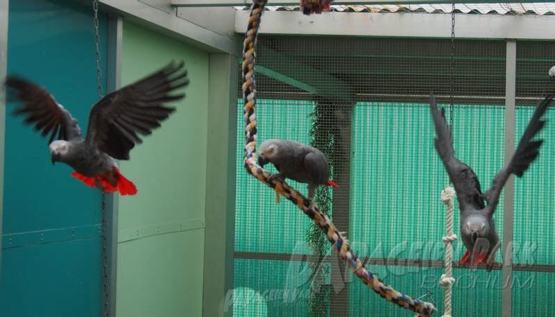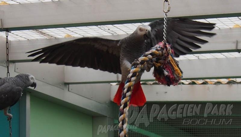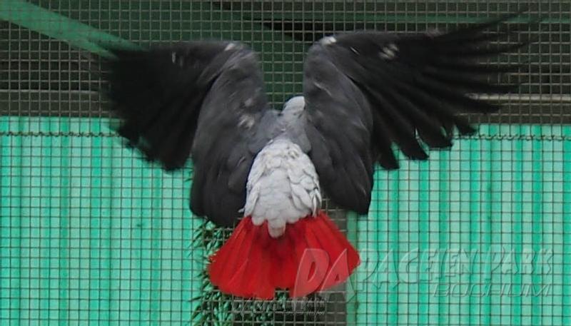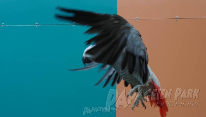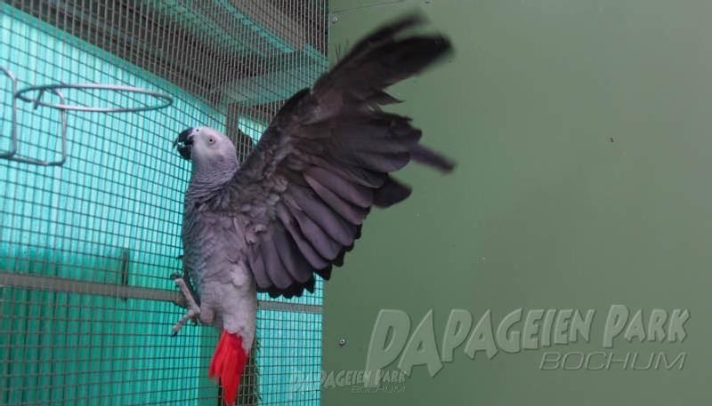 Die Volieren des Papageienparks bieten riesig viel Raum zum Fliegen. Ein Riesenspaß aucvh für die Graupapageien....